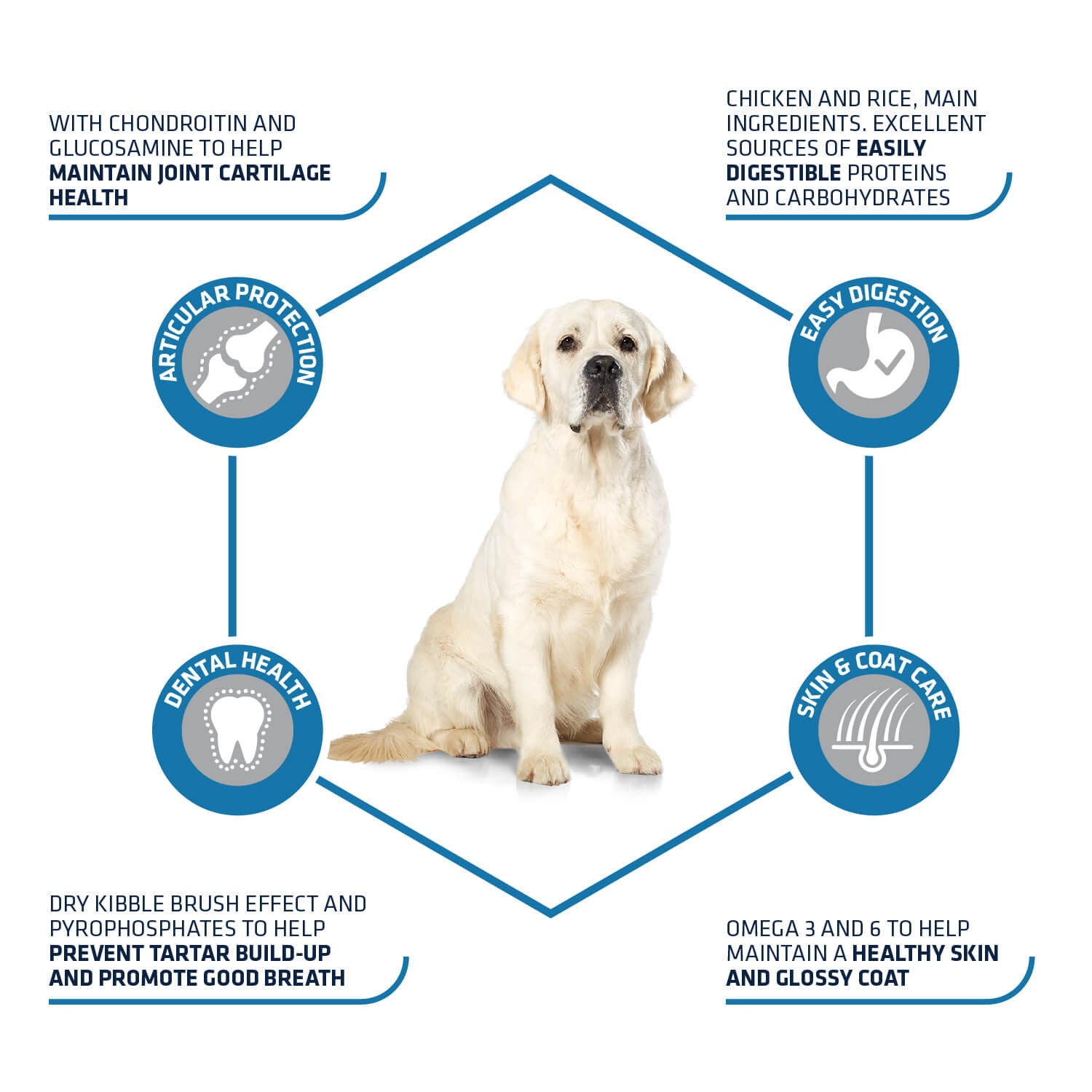 Samenstelling: Kip (16%), volkoren tarwe (15%), gedehydrateerde eiwitten van pluimvee, volkoren maïs, rijst (10%), pluimveevet, maïsmeel, gehydreerde eiwitten van varken, gedehydreerde erwten (4%), gehydrolyseerde dierlijke eiwitten (gevogelte, varken, vis), maïsweiwit, bietenpulp (1,5%), erwtenvezel, tarwevoerbloem, mineralen, chicorei-inuline (0,4%),, plasma-eiwitten van varken (natuurlijke bron van immunoglobulines) (0,4%), glucosamine (390 mg/kg), chondroïtinesulfaat (335 mg/kg)