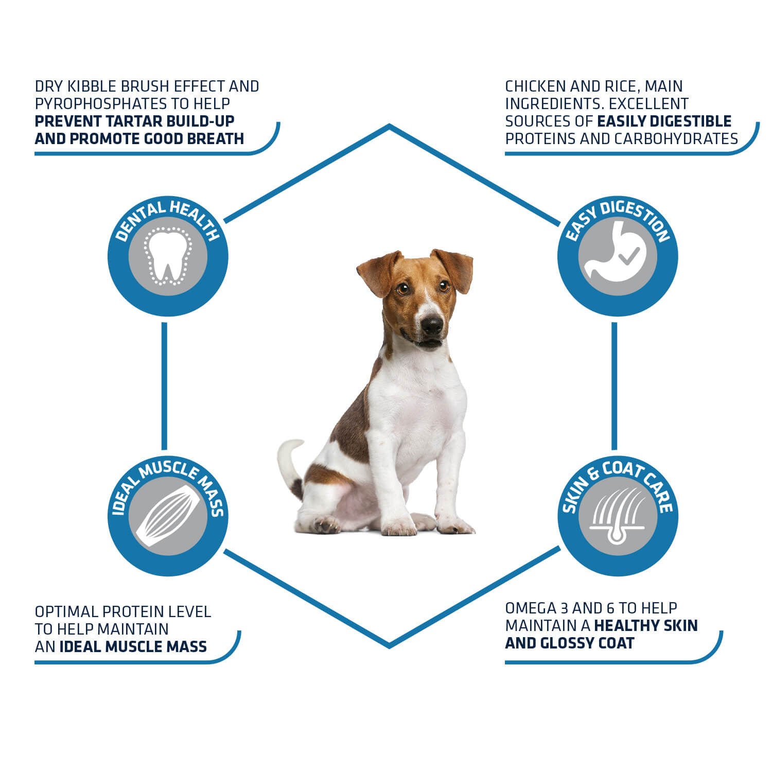 Dit smakelijke voer van Advance is speciaal gemaakt voor volwassen honden van kleine hondenrassen. Het voer heeft een formaat brok speciaal afgestemd op de grootte van de hond en helpt de tanden te verzorgen, om zo tandplak te helpen voorkomen. Het voer is samengesteld uit onder andere kip en rijst, die gemakkelijk verteerbaar zijn en zo een gezonde darmwerking stimuleren. Omega-3 en 6 zorgen voor een gezonde, glanzende vacht en huid en het optimale gehalte aan eiwitten helpt de spiermassa intact te houden. Een smakelijke brok voor een goede gezondheid!