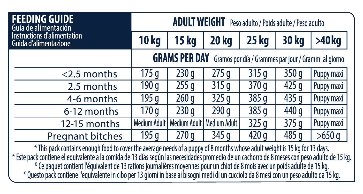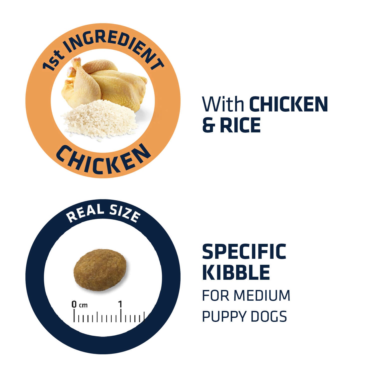 - Voer speciaal voor pups van middelgrote rassen, met een volwassen gewicht van 10 tot 30 kg
